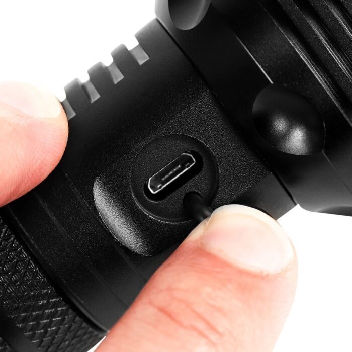 São 3 funções: alta, média e estrobo, com acionamento sequencial e seu indicador de carga bateria é próximo ao botão de acionamento. Possui zoom e fiel.